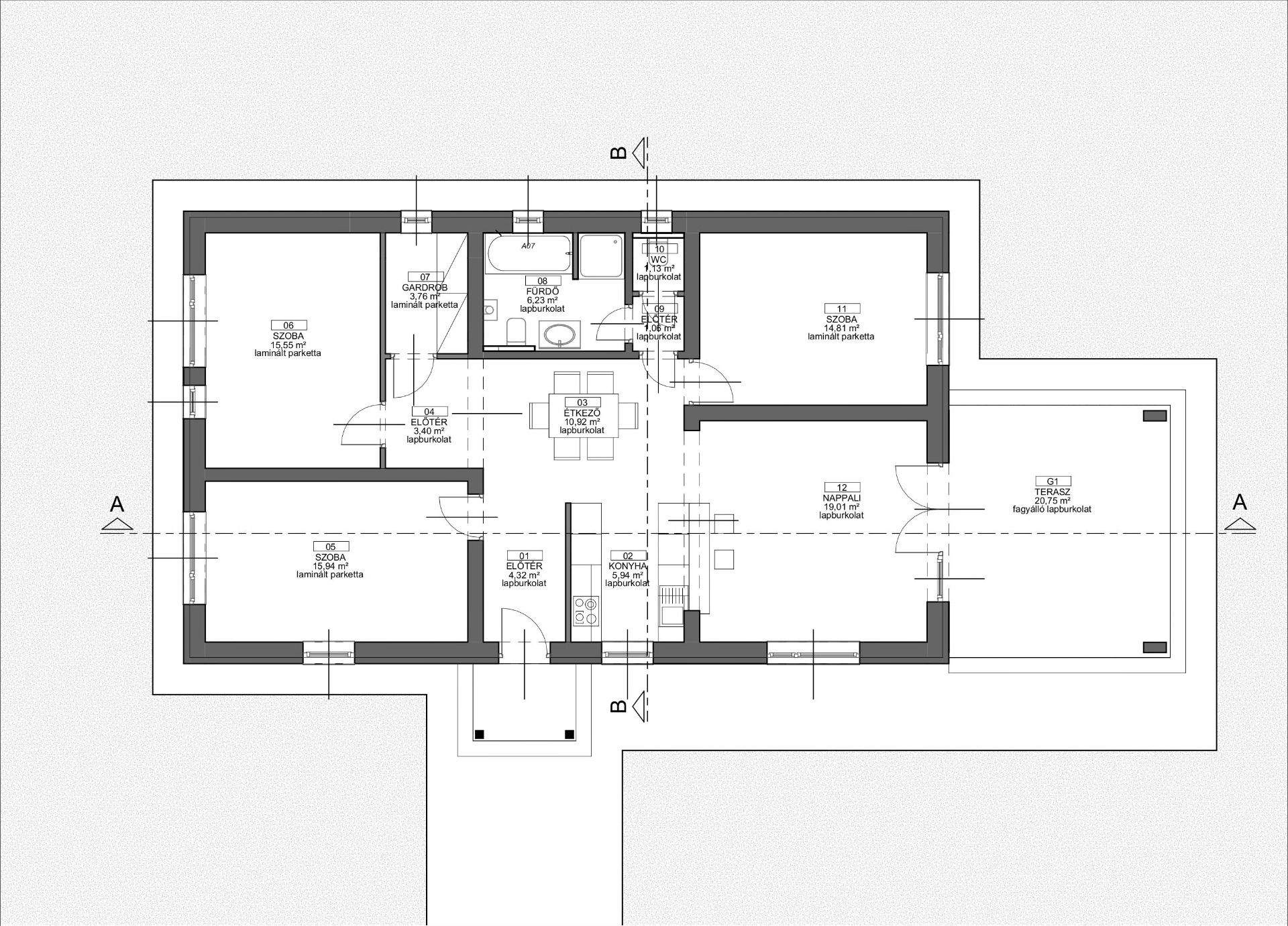 konyha és étkező, külön nappali, gardrób, 3 szoba, fürdőszoba, terasz